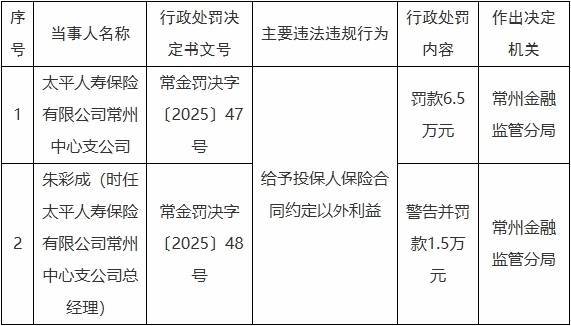 常州金融监管分局依据相关法律法规,对太平人寿保险有限公司常州中心支公司罚款6.5万元,对朱彩成给予警告并罚款1.5万元。